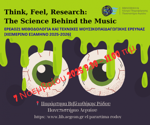 Στο πλαίσιο του μαθήματος ΕΡΕΑ021 – Μεθοδολογία και Τεχνικές Μουσικοπαιδαγωγικής Έρευνας (Χειμερινό Εξάμηνο 2025–2026) και σε συνεργασία με τη Βιβλιοθήκη και το Κέντρο Πληροφόρησης του Πανεπιστημίου Αιγαίου, συνδιοργανώνεται το εργαστηριακό ερευνητικό σεμινάριο με τίτλο «Think, Feel, Research: Th