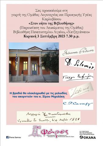 Νέα Συνάντηση της Ομάδας Λογοτεχνίας και Προαγωγής Ψυχοκοινωνικής Υγείας Καρλοβάσου μέσω Τέχνης. Τετάρτη 31 Γενάρη, στις 6.30 μ.μ. στη Βιβλιοθήκη του Πανεπιστημίου Αιγαίου "Χατζηγιάννειο κτίριο”.