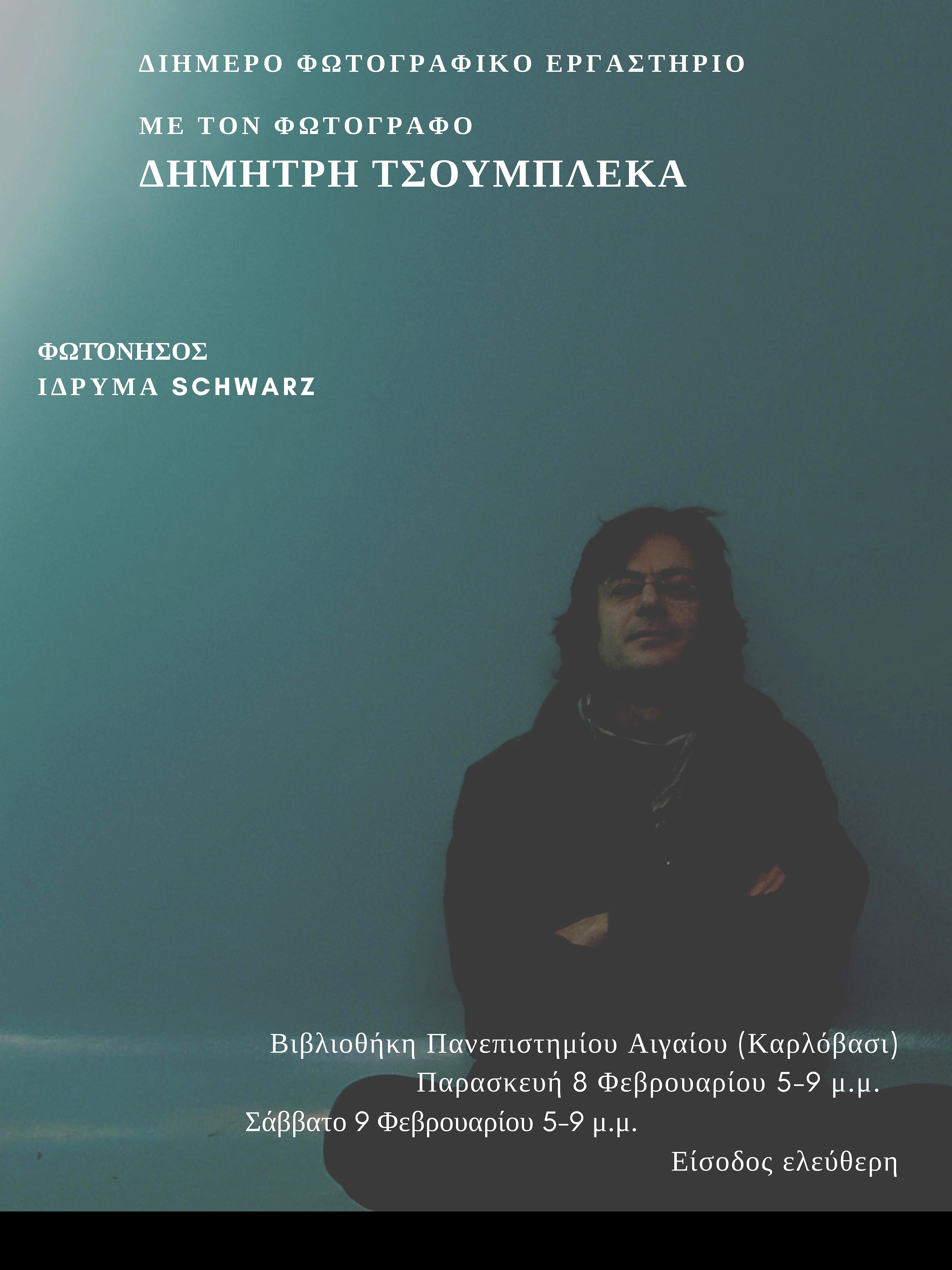 Διήμερο φωτογραφικό εργαστήριο με τον φωτογράφο Δημήτρη Τσουμπλέκα θα πραγματοποιηθεί στη Βιβλιοθήκη του Πανεπιστημίου Αιγαίου στο Καρλόβασι την Παρασκευή 8 Φεβρουαρίου (5-9 μμ) και το Σάββατο 9 Φεβρουαρίου (5-9 μμ) και απευθύνεται σε όλους όσοι ενδιαφέρονται για τη φωτογραφία. Η εκδήλωση συνδιοργανώνεται από το Ίδρυμα Schwarz, τη Φωτογραφική Ομάδα "Φωτόνησος" και το Παράρτημα Βιβλιοθήκης Σάμου του Πανεπιστημίου Αιγαίου. Η είσοδος είναι ελεύθερη για το κοινό.