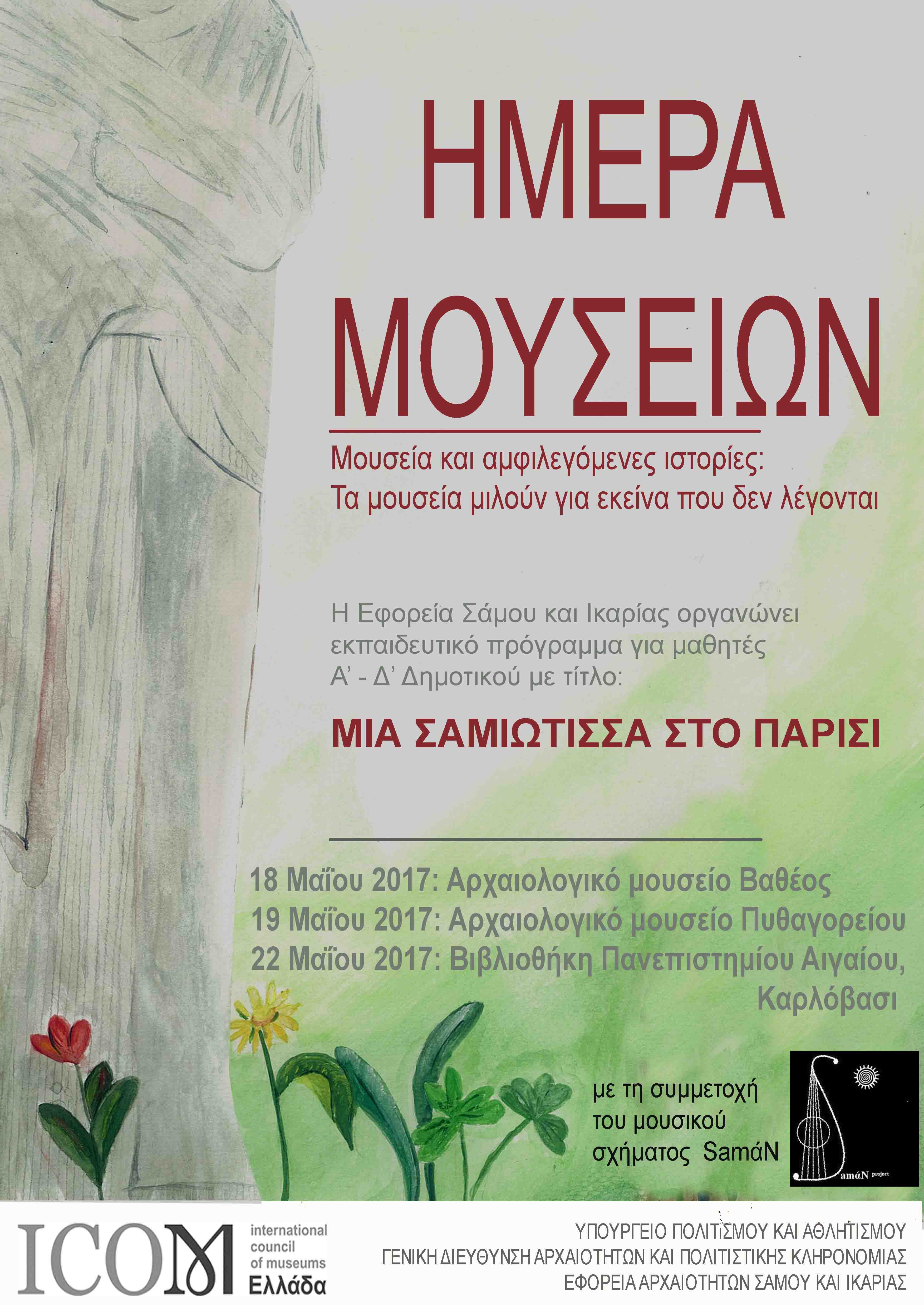 Στο πλαίσιο του εορτασμού της Διεθνούς Ημέρας Μουσείων 2017 "Μουσεία και αμφιλεγόμενες ιστορίες : Τα μουσεία μιλούν για εκείνα που δεν λέγονται", η Εφορεία Αρχαιοτήτων Σάμου - Ικαρίας διοργανώνει εκπαιδευτικό πρόγραμμα με τίτλο "Μια Σαμιώτισσα στο Παρίσι" από 18-22 Μαΐου 2017 για τους μαθητές των Δημοτικών Σχολείων του νομού.