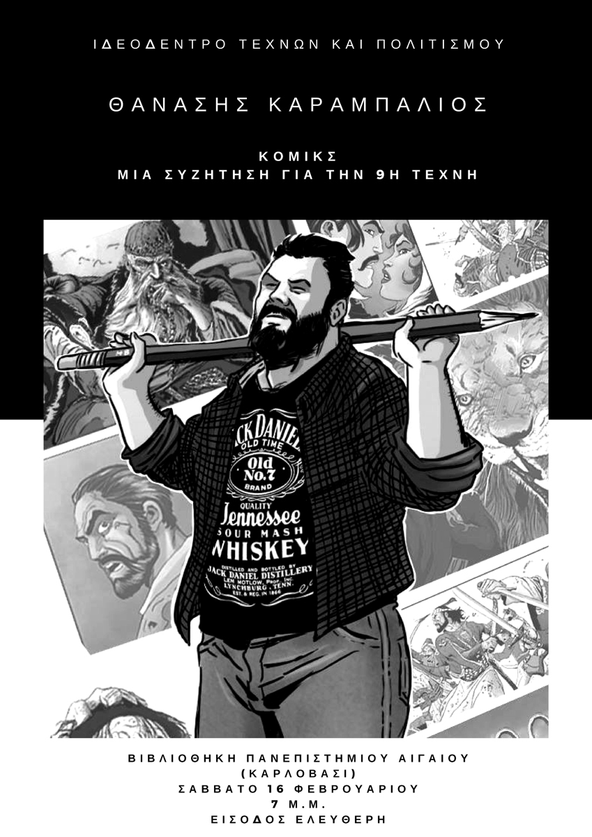 Το Ιδεόδεντρο Τεχνών & Πολιτισμού και η Βιβλιοθήκη του Πανεπιστημίου Αιγαίου φιλοξενεί τον κομίστα Θανάση Καραμπάλιο. Ο Θανάσης Καραμπάλιος θα παρουσιάσει στο κοινό το έργο του και θα ακολουθήσει συζήτηση που θα αφορά στον κόσμο των κόμικς.
