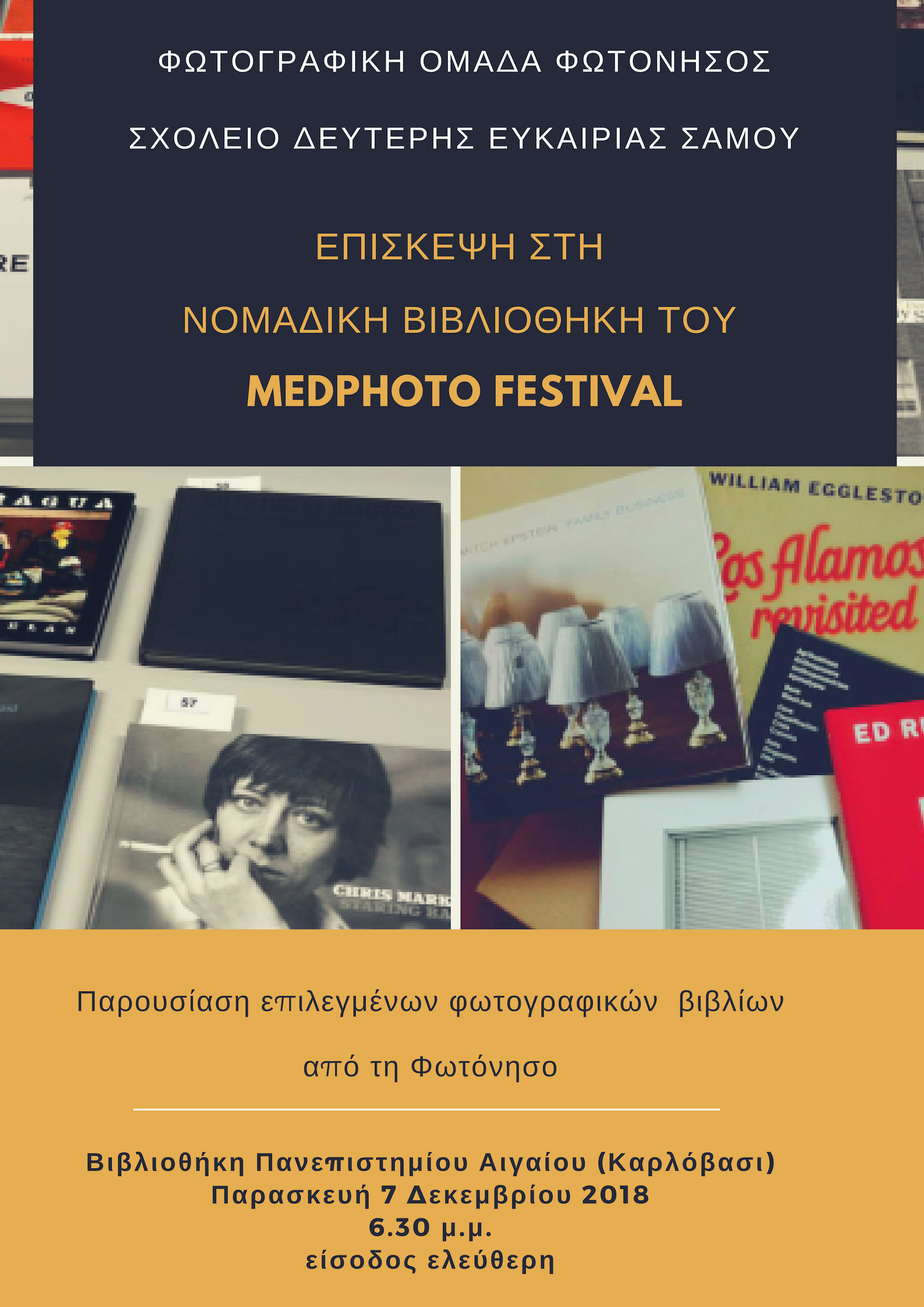 Η φωτογραφική ομάδα Φωτόνησος και το Σχολείο Δεύτερης Ευκαιρίας Σάμου επισκέπτονται την Παρασκευή 7 Δεκεμβρίου το Παράρτημα Βιβλιοθήκης Σάμου του Πανεπιστημίου Αιγαίου στο Καρλόβασι, προκειμένου να μελετήσουν τα φωτογραφικά βιβλία της Νομαδικής Βιβλιοθήκης του Medphoto Festival.