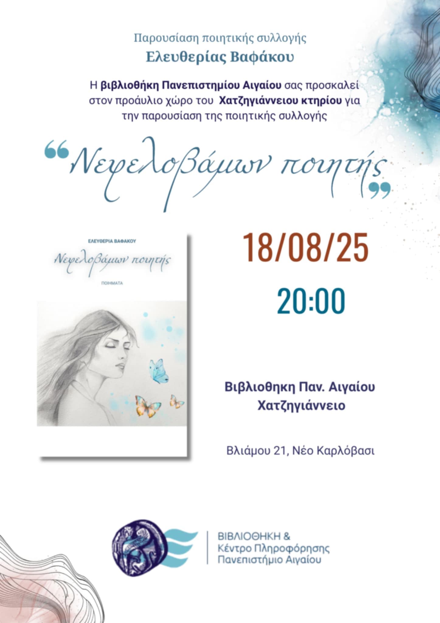 Η Βιβλιοθήκη του Πανεπιστημίου Αιγαίου και η Ελευθερία Βαφάκου σας προσκαλούν στην παρουσίαση της νέας ποιητικής συλλογή της. Μια καλοκαιρινή βραδιά αφιερωμένη στη ποίηση και την τέχνη.