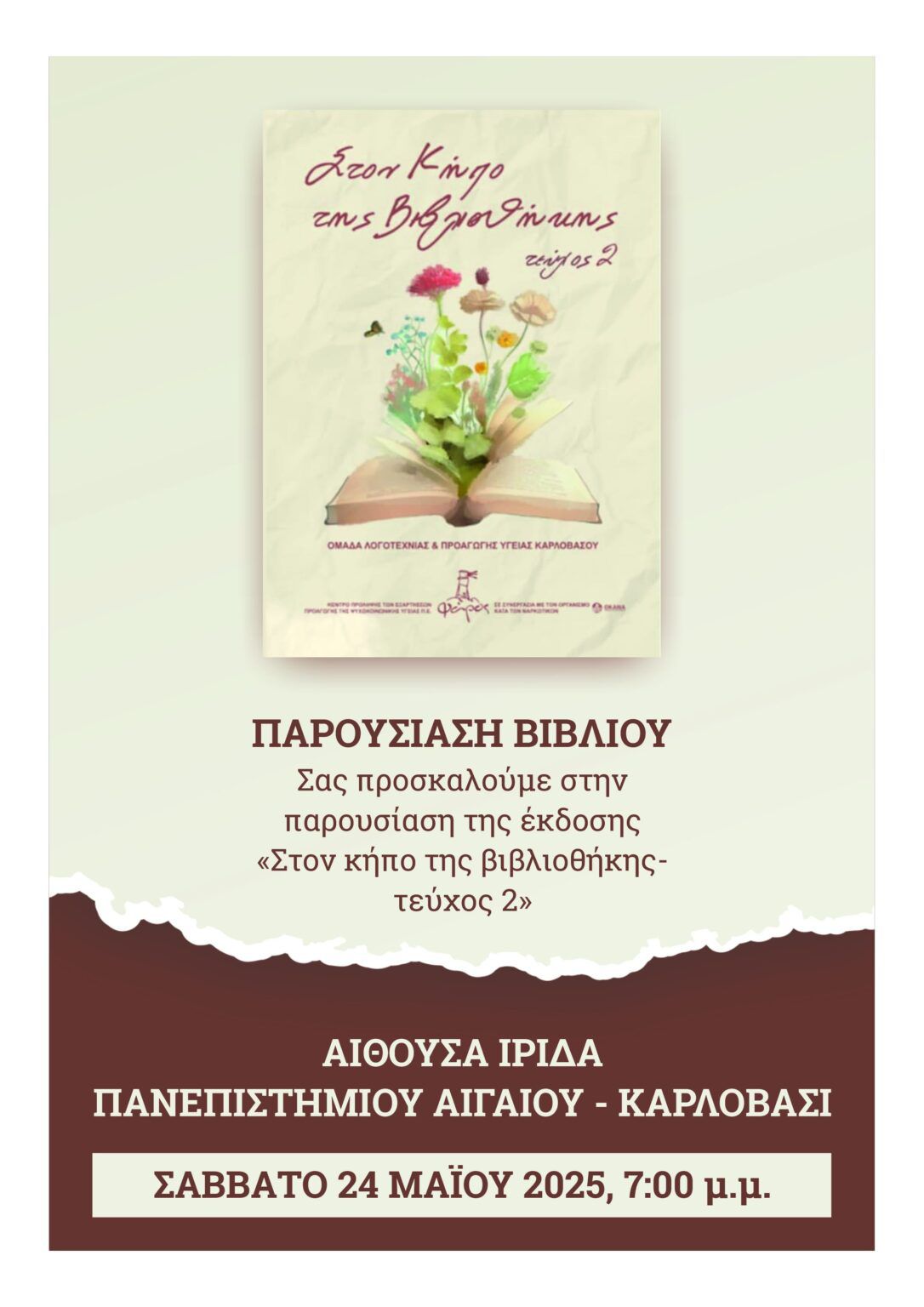 Η Εθελοντική Ομάδα Πρόληψης και Προαγωγή Υγείας που λειτουργεί στο Καρλόβασι υπό τον συντονισμό τον «Φάρος» Κέντρο Πρόληψης των Εξαρτήσεων και Προαγωγής της Ψυχοκοινωνικής Υγείας Π.Ε. Σάμου και σε συνεργασία με την Βιβλιοθήκη του Πανεπιστημίου Αιγαίου (Παράρτημα Βιβλιοθήκης Σάμου) σας προσκαλεί στην παρουσίαση των δράσεων της και της έκδοσης του λευκώματος "Στον κήπο της βιβλιοθήκης" το Σάββατο 24 Μαΐου 2025 στις 7:00 μ.μ. στην αίθουσα Ίριδα του Πανεπιστημίου Αιγαίου (απέναντι από το Γυμνάσιο).