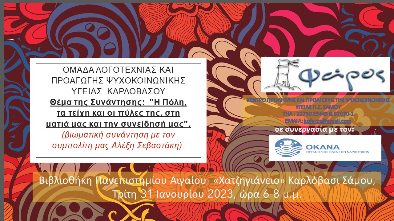 Τρίτη 31 Ιανουαρίου 2023, ώρα 6μμ στην Βιβλιοθήκη του Πανεπιστημίου Αιγαίου, Καρλόβασι.