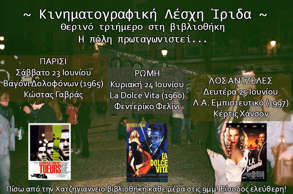 Το Σάββατο 23 Ιουνίου θα προβληθεί η ταινία "Βαγόνι δολοφόνων" του Κώστα Γαβρά (Παρίσι 1965), την Κυριακή 24 Ιουνίου θα προβληθεί η ταινία ”La dolce vita” του Φεντερίκο Φελίνι (Ρώμη 1960) και τη Δευτέρα 25 Ιουνίου η ταινία «Λ.Α. εμπιστευτικό» του Κέρτις Χάνσον (Λος Άντζελες 1997).