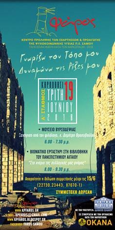 Το Παράρτημα Βιβλιοθήκης Σάμου του Πανεπιστημίου Αιγαίου φιλοξενεί την εκδήλωση του Κέντρου Πρόληψης Π.Ε. Σάμου “Φάρος” για την Παγκόσμια Ημέρα Κατά των Ναρκωτικών 2018 με τίτλο «Γνωρίζω τον τόπο μου, Δυναμώνω τις ρίζες μου».